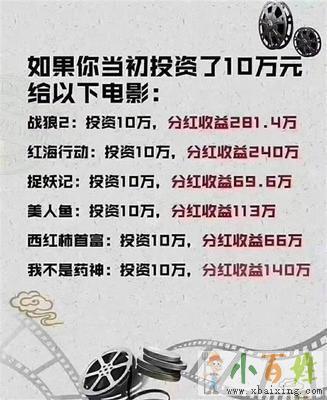 记得在节目《鲁豫有约》中有一段主持人采访向华强(创办中国星集团)的对话,主持人:“您为什么选择做电影呢?”,“我做电影的目的就是为了赚钱!”向华强直言。既然电影市场这么好,为什么不去赚钱呢x+b+a+i+x+i+n+g+c+o+m。好一个赚钱,说的主持人瞬间哑口无言。