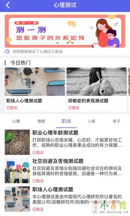 另外,聆听之心APP还有全屏直播、即时倾诉、心理测试、阅读社区、一对一预约咨询等板块,给用户提供了更多纾解压力的选择。无论是婚恋情感、亲子教育还是职场关系、家庭关系等烦恼,都可以在聆听之心APP获得帮助来自www.xbaixing.com。